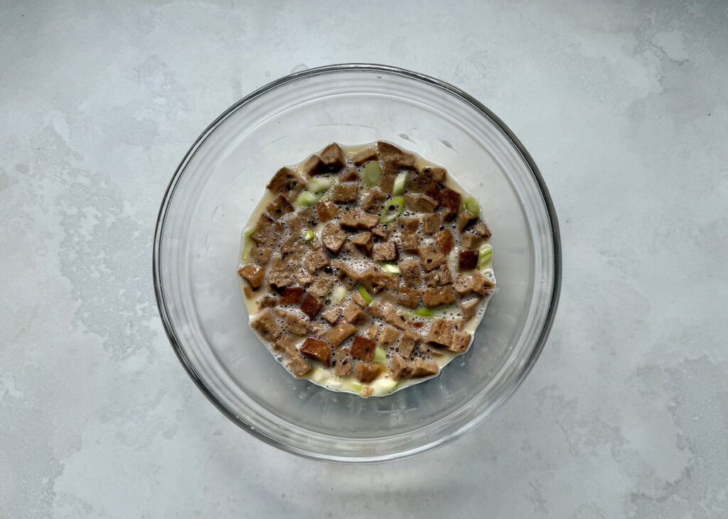 • Promíchejte a nechte pečivo zcela nasáknout - mělo by změknout, ale ne se rozpadnout na kaši. Bude to podle druhu pečiva trvat od 5 minut (u světlého jemného toastového chleba) do půl hodiny (u poctivého kváskového chleba).